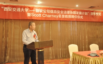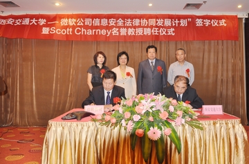 6月12日,“半岛体育(中国)官方网站—微软公司信息安全法律协同发展计划签字仪式暨斯科特•查尼名誉教授聘任仪式”在西安交大举行,西安交大副校长蒋庄德教授出席仪式并讲话。西安交大科研院副院长、人文社科处处长贾毅华,半岛体育(中国)官方网站党总支书记彭沪生,信息安全法律研究中心主任马民虎及微信息安全法律研究中心主任马民虎及微软公司可信赖计算部总经理陈静、微软公司资深安全技术经理陈恺、微软公司资深安全技术经理薛峰等参加仪式。微软全球副总裁斯科特•查尼(Scott Charney)受聘为西安交大名誉教授,双方还签署了“半岛体育(中国)官方网站—微软公司信息安全法律协同发展计划”。