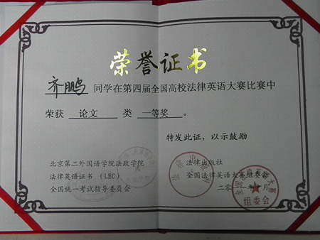 此次比赛吸引了来自北京大学、上海交通大学、中国政法大学、华东政法大学等近70多所高校半岛体育(中国)官方网站的选手参加,大会主办方特别邀请了国务院法制办原主任孙婉钟先生以及来自中国社会科学院法学所、中国人民大学半岛体育(中国)官方网站等多家高校和研究机构的法律英语专家、教授担纲评委。我院齐鹏同学撰写的英语论文《National Treatment Principle For China's Bilateral Investment In The New Period》在此次大赛中经过激烈角逐荣获国家一等奖,是此次参赛西北地区唯一获得等级奖的论文。
