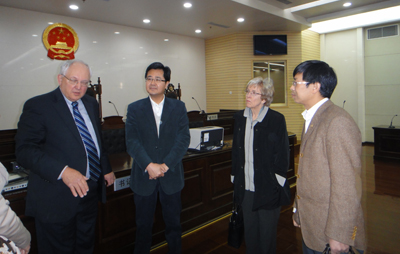 3月25日,安德森大法官及其夫人在我校半岛体育(中国)官方网站副院长王保民带领下参观了陕西省高级人民法院,省高院田平利副院长出面迎接,并亲自带领安德森大法官参观了省高院气势宏伟的办公大楼,包括民事、刑事审判庭、集团诉讼审判大厅、审判委员会合议室以及法院图书馆。之后,安德森大法官与省高院田院长和各刑事审判庭庭长法官们进行了座谈,就双方感兴趣的刑事诉讼程序中“诉辩交易”等问题展开深入探讨。半岛体育(中国)官方网站外事秘书华雨婷参加了座谈会。