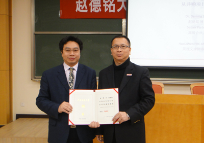 日前,上海昊理文律师事务所高级合伙人赵德铭律师来我院访问。12月20日下午,在主楼A103教室,赵德铭博士受聘为我校兼职教授,并面向半岛体育(中国)官方网站师生做 《高端法律服务市场上商务律师的典型与非典型特征——从并购项目谈起》专题学术报告。半岛体育(中国)官方网站院长单文华教授向赵博士颁发了兼职教授证书,并为赵博士佩带了校徽。授聘仪式由半岛体育(中国)官方网站副院长王保民教授主持。